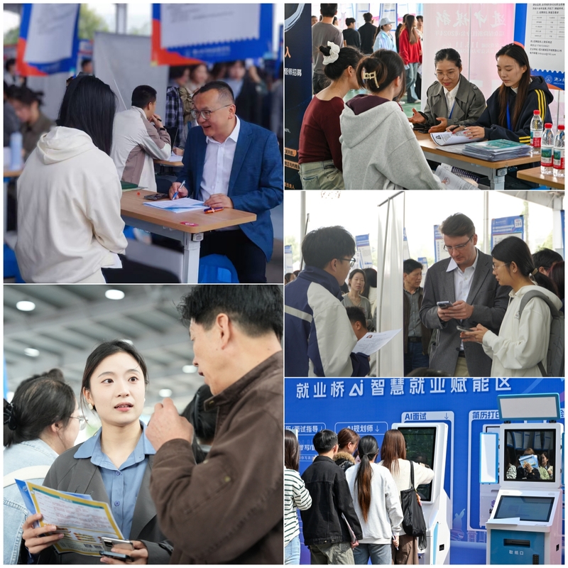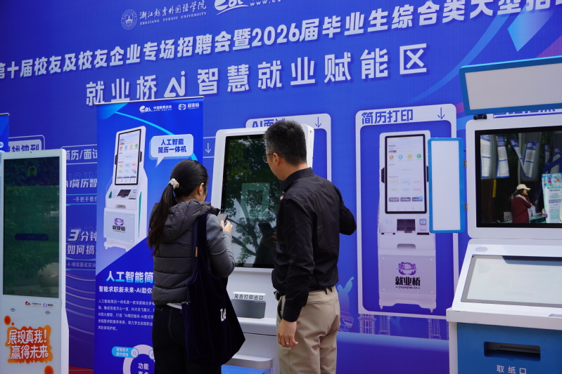 尤为引人注目的是“AI智慧就业赋能区”,学校首次将人工智能深度整合进求职全流程,为学生提供覆盖“就业查询-生涯探索-简历优化-模拟面试”的一站式人工智能就业服务专区,现场同学积极体验就业服务一体机、生涯探索一体机、简历打印一体机、人工智能模拟面试屏,深受广大师生喜爱。通过AI赋能,在提升了毕业生求职竞争力的同时,更精准、更高效的促进人岗匹配。