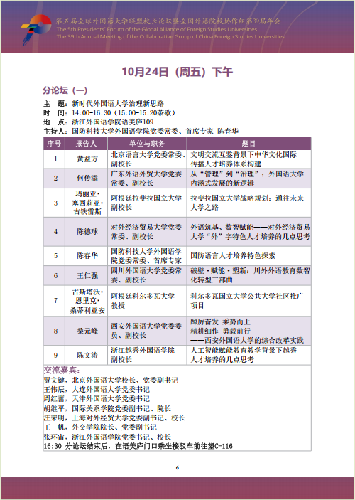 10月24日,第五届全球外国语大学联盟校长论坛暨全国外语院校协作组第39届年会在浙江外国语学院举行。我校副校长陈文涛教授受邀参会,并以“人工智能赋能教育教学背景下越秀人才培养”为主题在分论坛作交流发言,分享学校在应用型人才培养方面的实践与思考。