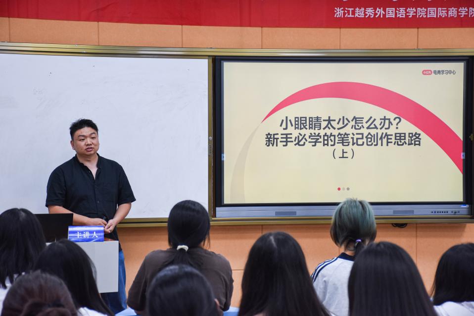 本期讲座主要讲解如何拆解平台生态3大核心价值,手把手教“好”笔记创作逻辑。分享流量获取三步法,破解“小眼睛太少”难题,以及新手必学的起号与内容思路全解析。讲座率先由讲师团队吴柏逸老师发言,介绍了相关项目的落地以及与小红书合作的初衷,突出强调搭建赋能平台,通过校企合作放大学生的营销价值,帮助他们在未来社会中有更多自主选择的机会。接着,小红书武汉团队商务经理余子城老师主讲平台运营知识,解说平台优势点,并分享学校学员徐昊线上运营服饰店铺的成功案例。最后,小红书内容运营负责人杨洋老师提出观点,要打造小红书爆款推文,封面标题是关键,还需结合有效引导转换。