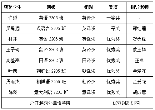 我校学子在此项高水平赛事中取得佳绩,是学校长期重视外语教学质量、持续深化翻译专业内涵建设的成果体现,充分彰显了我校外语教学改革的成效与翻译人才培养质量的提升。未来,学校将继续以高水平学科竞赛为引领,持续优化人才培养模式,完善“以赛促教、以赛促学、以赛促改”育人机制,着力强化学生语言应用能力与跨文化交际素养的培育,助力更多越秀学子在国际舞台上展现中国青年的语言风采与文化担当。