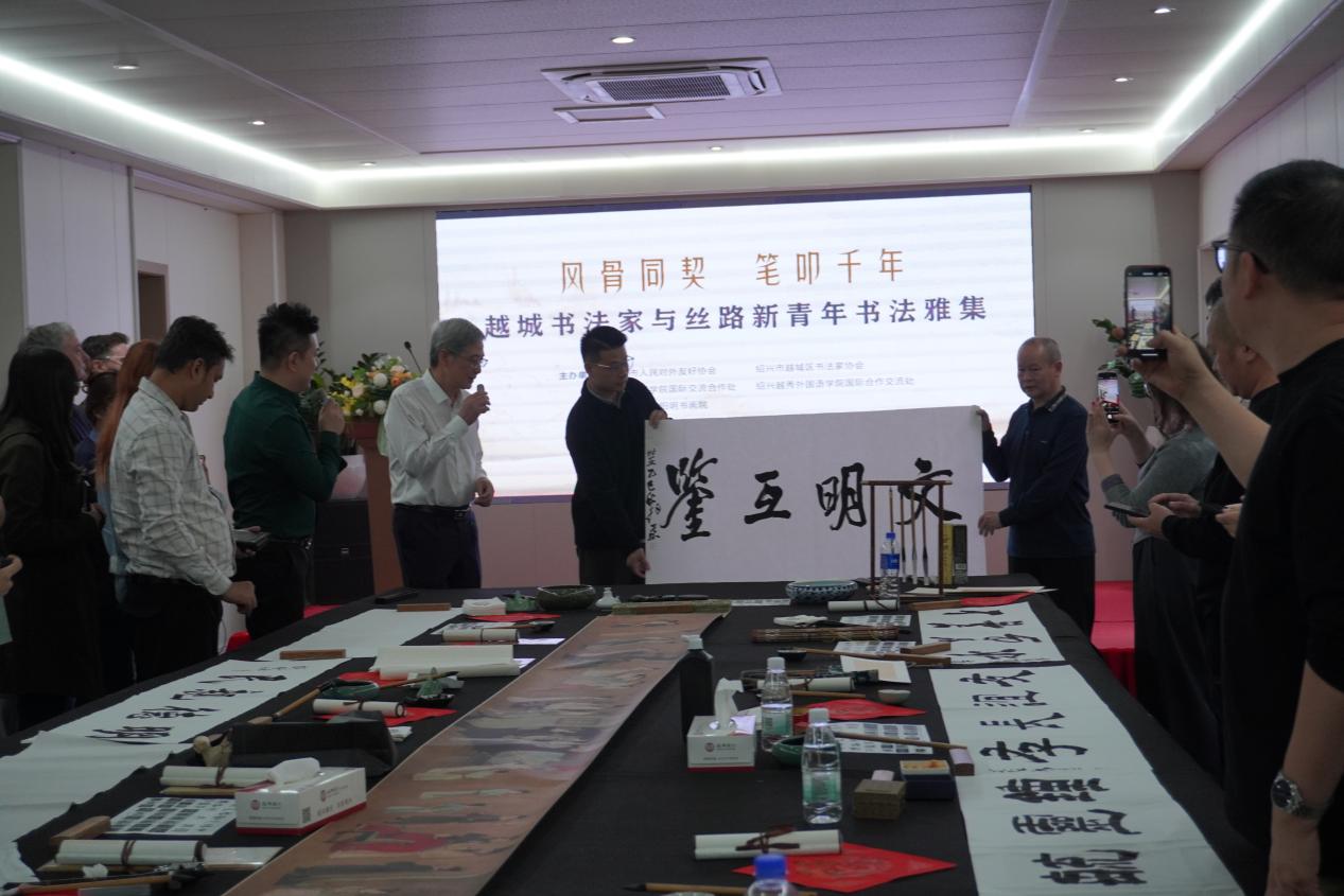 10月25日下午,由绍兴市人民对外友好协会、绍兴市越城区书法家协会等机构主办的“风骨同契 笔叩千年——越城书法家与丝路新青年书法雅集”活动在新中友好文化艺术交流中心举行。出席本次活动的领导和嘉宾有绍兴市越城区人大主任、友协会长徐荻,绍兴市越城区书法家协会主席王志刚及越城区多位书法名家。我校来自哈萨克斯坦、意大利、印度等多个国家的三十余名外教参加本次活动,活动由绍兴市人民对外友好协会副会长曾险主持。