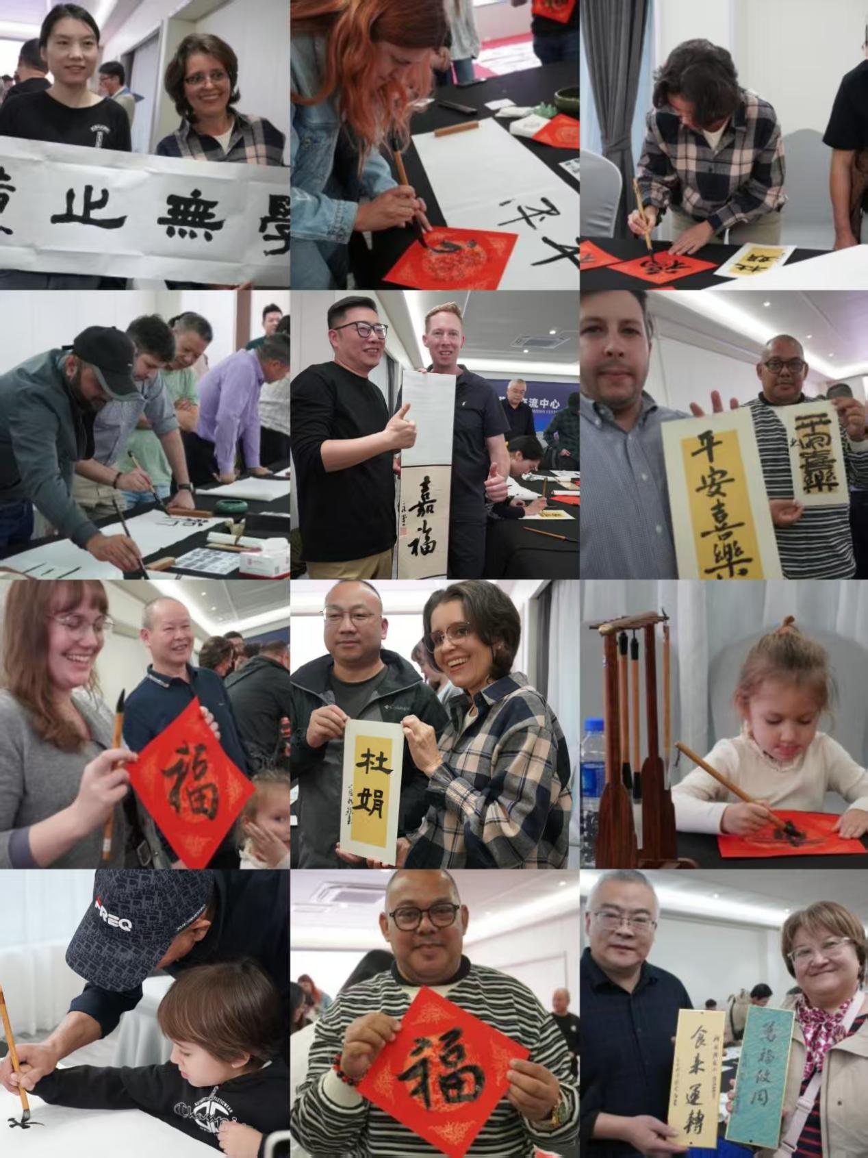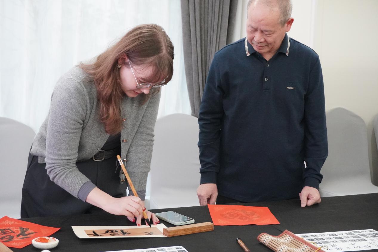 在书法家的鼓励与悉心指导下,外教们饶有兴致地提起毛笔,从执笔姿势到基本笔画,一步步感受汉字书法的精妙之处。有的学写自己的中文名,有的则选取自己喜欢的汉字进行书写,比如“中国”“友好”“喜乐”“福”等。在书写间隙,不时地彼此探讨对作品的理解与解读。