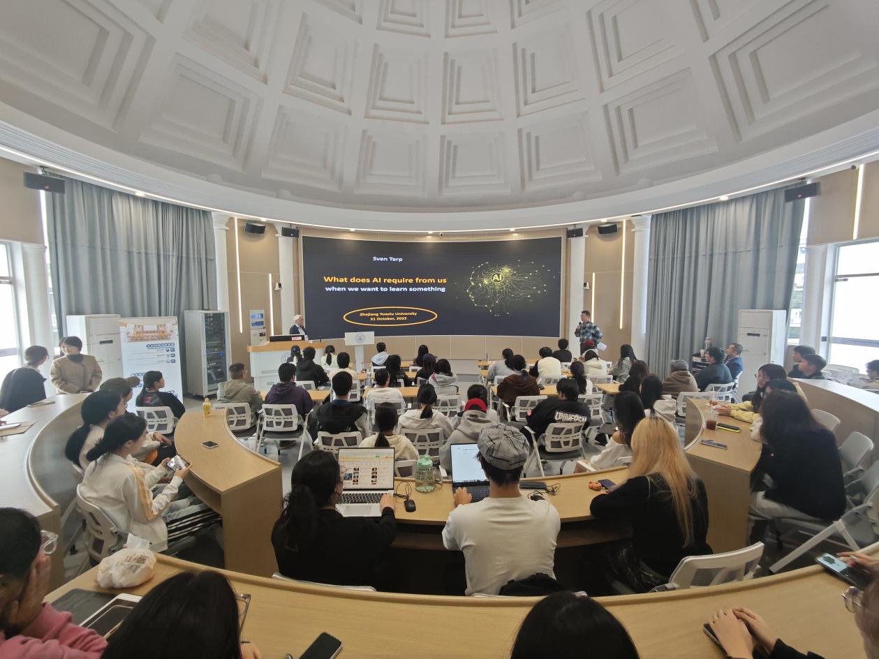 2025年10月31日,丹麦奥胡斯大学(University of Aarhus)教授、国际知名词典学家、现代功能词典学理论创始人斯宛·塔普(Sven Tarp)应邀来浙江越秀外国语学院,以“What does AI require from us”(AI要求我们做什么)为题,为英语学院师生深度解析人工智能时代人机协作的核心逻辑与人类的独特价值。讲座由英语学院教师周成龙博士主持。