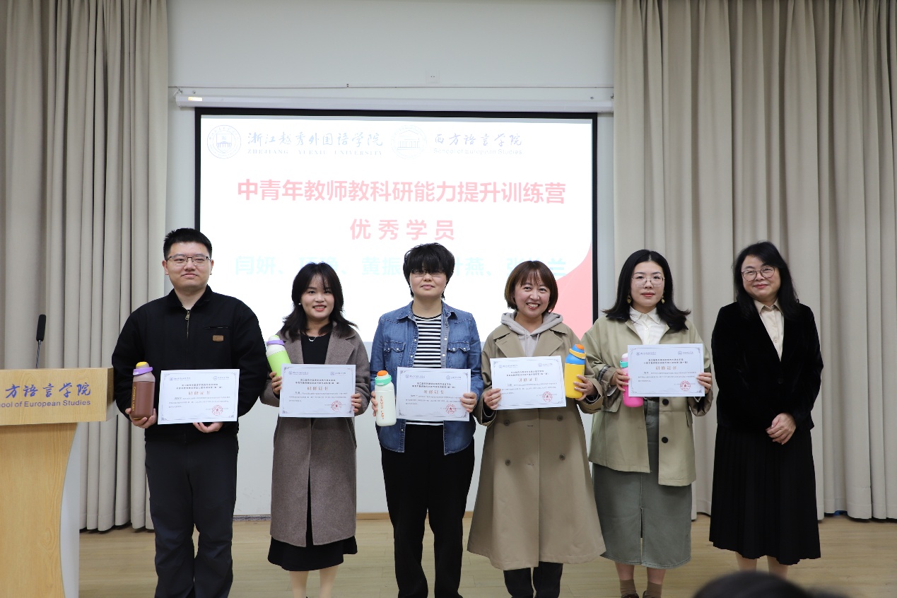 11月14日,西方语言学院举行了训练营结营仪式。现场氛围热烈,闫妍、叶燕、张怡兰、项琤、黄振宇五位教师被评为优秀学员,西方语言学院党委书记陆海萍为他们颁奖并致以热烈祝贺。此次活动营造了浓厚的学术氛围,为教师们的教科研能力提升打下了坚实的基础。与会教师纷纷表示受益匪浅,并将把所学成果积极运用于教学与科研实践中,不断创新突破,实现个人成长与学院发展的双重提升。