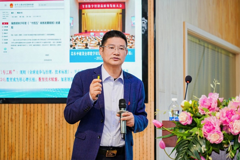 在上午的主旨报告环节,数字贸易学院院长单胜江以“‘AI+数字贸易’产业学院建设与育人模式创新实践”为题,系统介绍了我校基于产教融合、校企合作的多语言跨境电人才培养的探索历程与阶段性成果。单胜江指出,学校通过与头部企业共建产业学院,搭建了“教学-实训-就业”一体化平台,形成“企业导师驻校、项目案例进课堂、学生作品变产品”的特色育人机制。近两年学生获省级以上学科竞赛奖项同比增长65%,毕业生起薪较传统商贸专业提升40%,真正实现了“入学即入行、毕业即就业”的育人目标。