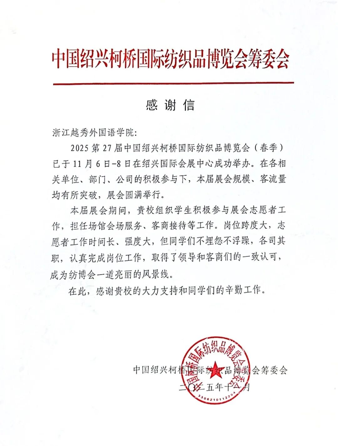 2025第27届中国绍兴柯桥国际纺织品博览会(秋季)于11月圆满闭幕,我院45名蒲公“英”以志愿者身份深度参与其中,其卓越表现获多方赞誉。他们在展会期间承担场馆运营支持、国际客商引导等多元任务,面对高强度工作始终坚守岗位、细致服务,凭借高度责任心保障了展会各环节顺畅运行。蒲公“英”们以青春力量彰显了新时代大学生的担当,不仅赢得组委会与参展商的交口称赞,更成为展会中传递热忱与专业的鲜活名片,收到了来自中国绍兴柯桥国际纺织品博览会筹委会的感谢信。