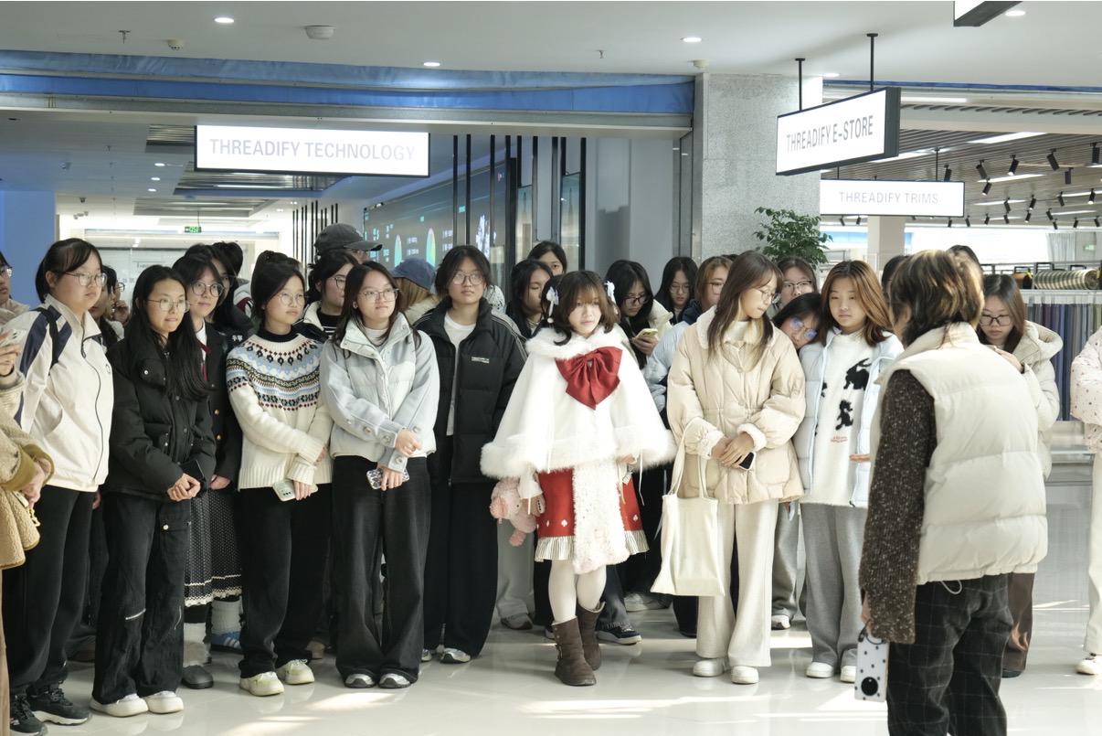 为强化学生对服装产业链前端的认知,12月3日下午,网络传播学院2025级时尚传播专业学生在沈迪老师的带领下,走进THREADIFY服装原材料及设计研发企业,开启了一场“实地探访+沉浸式课堂”相结合的实践学习之旅——这是时尚传播《专业导学》课程中将时尚内容与产业连接的一环。通过近距离观摩面料研发生产流程、聆听行业总监的专业分享,大一新生跳出课本,直观触摸时尚产业的真实脉络。