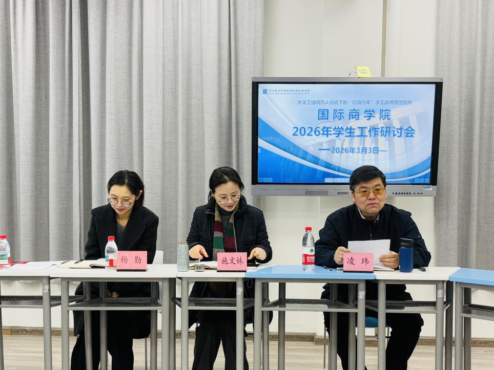 为进一步探索新时代商科院校学生工作新模式、新路径,持续提升“红商青年”学工品牌育人实效,3月3日上午9时,国际商学院于2-421会议室召开了主题为“大学工协同育人模式下的‘红商青年’学工品牌路径提升”的学生工作研讨会。学生处学工部(处)副部(处)长杨勤、国际商学院党委书记施文妹出席会议,学院全体辅导员参与研讨,会议由学院党委副书记凌玮主持。