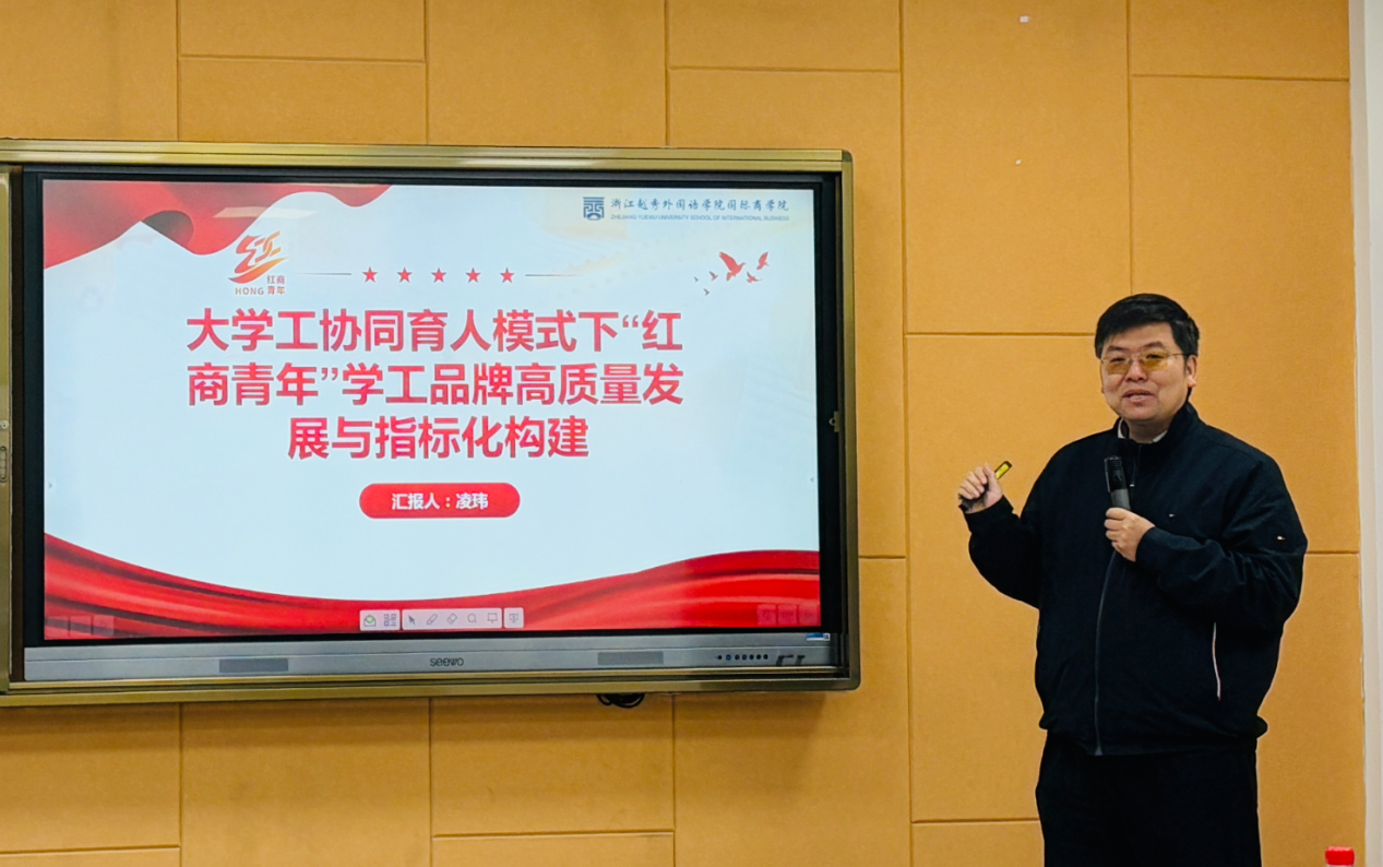 会上,凌玮副书记以“红商铸魂”为核心,围绕“红商青年”学工品牌打造作重点发言,系统阐述了文化制度育人、管理服务育人、创新发展育人三大体系的构建思路,明确了品牌建设的分阶段指标,细化落地举措,规划重点工作,旨在以体系化建设推动学工品牌高质量发展,致力于培养兼具国际视野与商科素养的新时代青年。