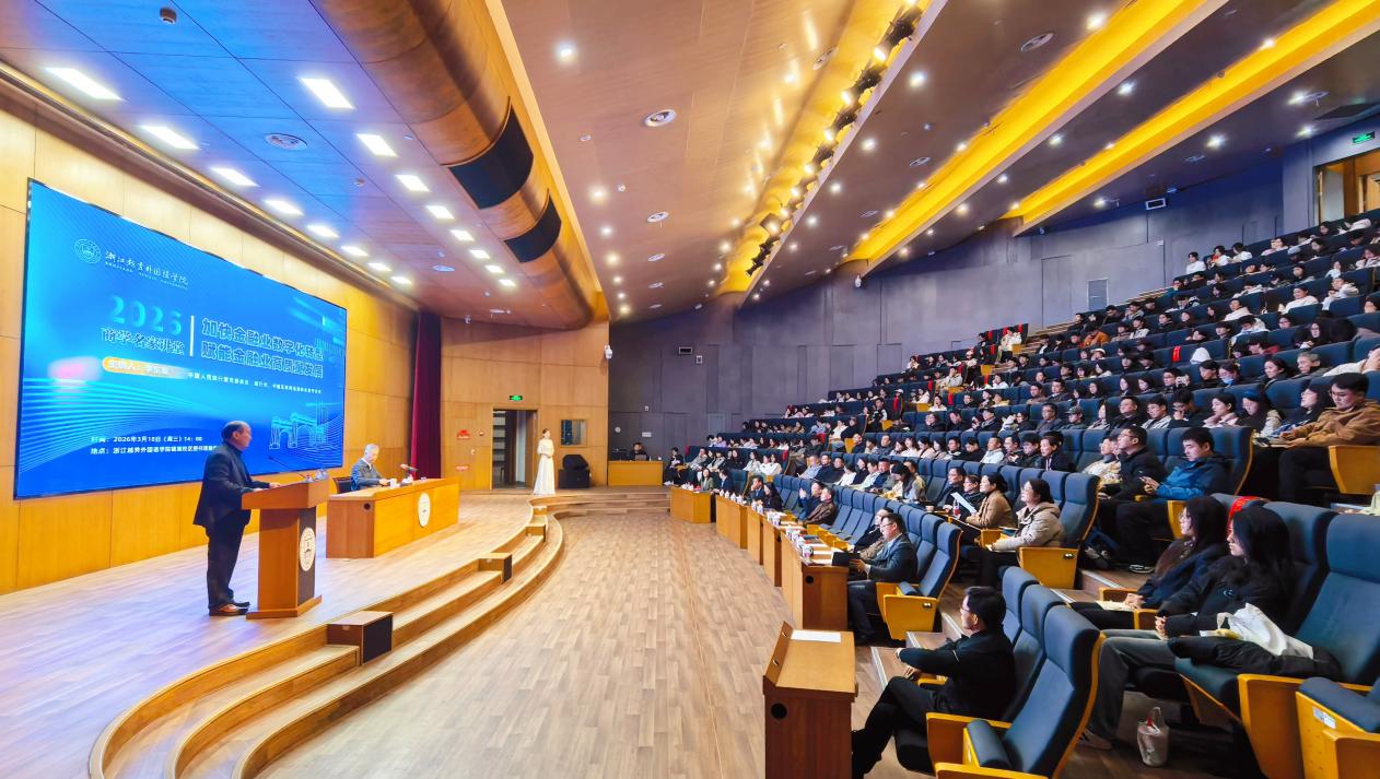 3月18日下午,浙江越秀外国语学院“商学名家讲堂”第二讲学术报告会在镜湖校区图书馆报告厅举行。中国人民银行原副行长、中国互联网金融协会首任会长李东荣应邀作题为《加快金融业数字化转型,赋能金融业高质量发展》的学术报告。学校校长雍和明、党委书记罗继红、副校长陈文涛、党委副书记高志栋、纪委书记高琴波、财务总监刘芳露以及学校中层干部、镜湖校区师生代表300余人到场聆听。校长雍和明教授主持报告会。