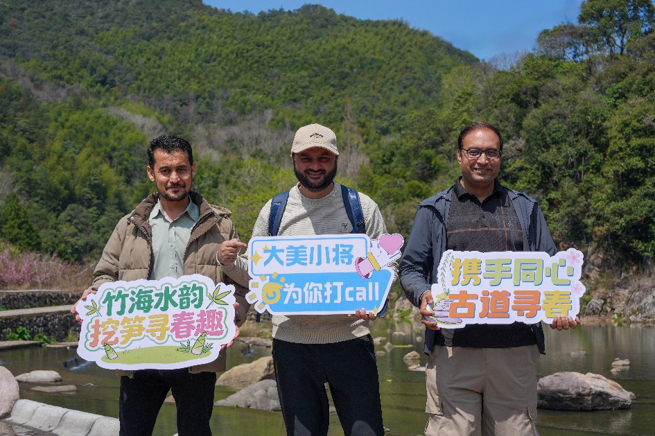 随后,大家开始徒步著名的“十八渡”盐帮古道。这条承载着千年商旅记忆的古道沿溪而建,沿途溪水潺潺、草木葱茏,碇步桥错落排布,一步一渡、一渡一景。行走其间,大家沉醉于每一渡的自然景致,频频驻足拍照,将古道的诗意风光收入镜头。徒步途中,大家兴致勃勃地踏入竹林,亲身体验挖春笋的乐趣。泥土的芬芳与收获的喜悦交织,让国际友人们真切感受到了绍兴乡村的质朴风情与丰盈的自然馈赠。来自美国的留学生俊和拿着自己亲手挖到的笋很兴奋,他觉得挖竹笋的过程非常有趣,也让他更加理解了中国人‘不时不食’的饮食智慧。