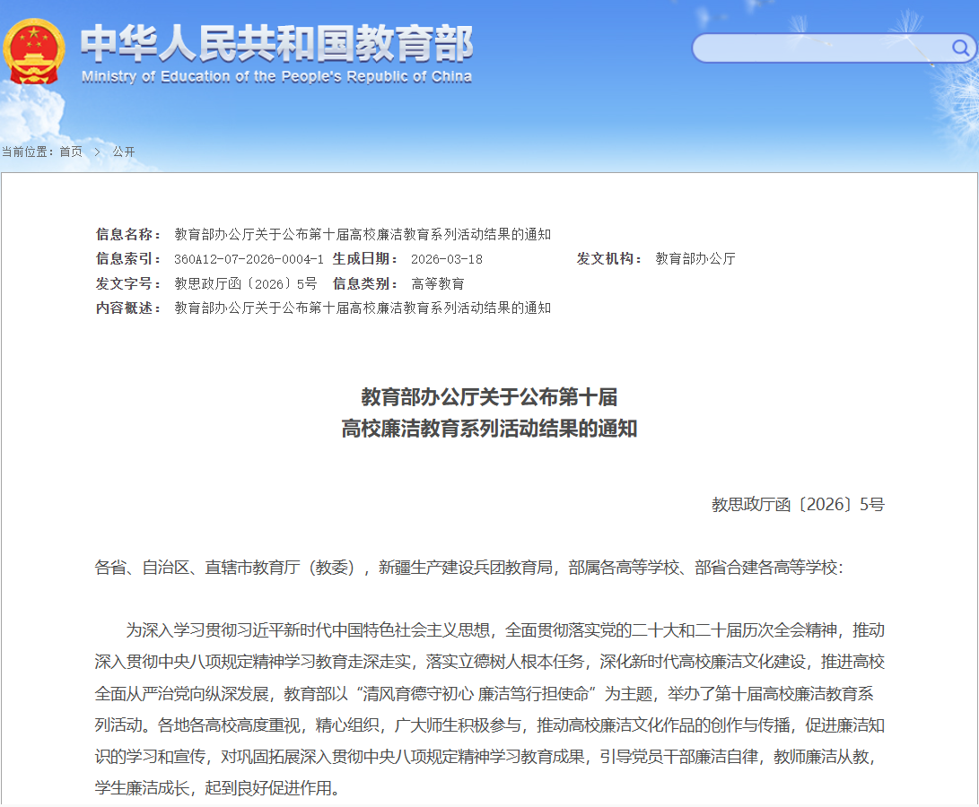 教育部高校廉洁教育系列活动优秀作品评选,是面向全国高校廉洁文化创作与教育成果的高规格展示平台,由教育部思想政治工作司主办。经各高校选拔申报、各省教育厅审核推荐及教育部评审后确定最终入选名单,目前已举办十届。本届入选作品共分七大类,其中视频类共遴选出优秀作品101件,浙江省入选5件,我校为浙江省民办高校中唯一获奖单位。