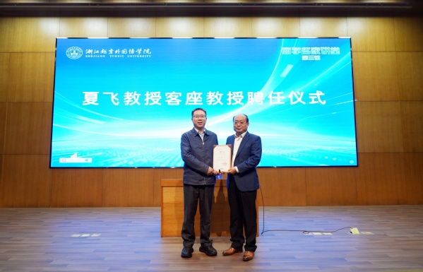 仪式上,雍和明校长代表学校向夏飞教授颁发客座教授聘书,并对夏教授的加入表示热烈欢迎。雍校长指出,夏飞教授在经济学、贸易经济等领域具有深厚的学术造诣和广泛的影响力,其加盟将为我校学科建设和科研工作注入新的活力。随后,郭杰简要介绍了夏飞教授的学术背景与主要成就。
