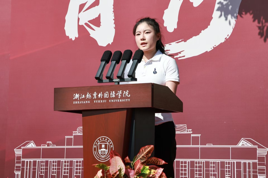 9 月 25 日,我校 2025 级新生开学典礼暨军训总结表彰大会在稽山、镜湖两校区同步举行。师生齐聚现场,共同见证5800余名 “新越秀人” 的青春启航,携手开启大学梦想新篇章。典礼特别邀请 2018 届英语专业毕业生徐诗琪、2023 届国际经济与贸易专业毕业生董丽莎两位优秀校友返校,以越秀学长成长的亲历者身份为新生分享在越秀成长、成才的心路历程和感受感悟,并用自身的成长经历向学弟学妹提出宝贵建议。
