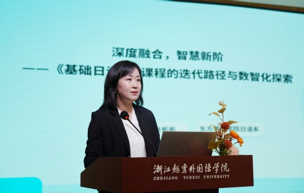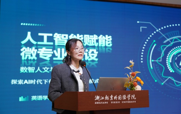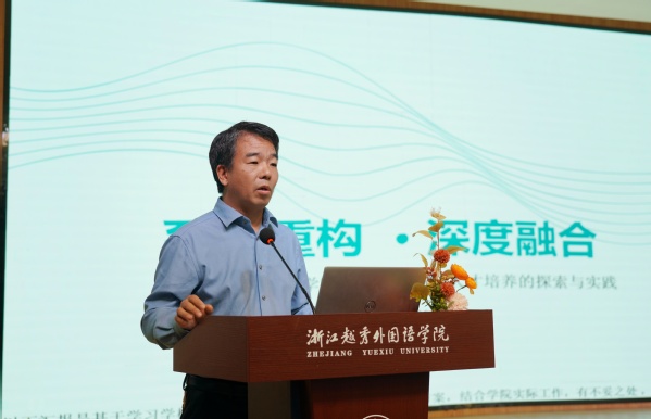 会上,二级学院代表从不同层面分享实践经验,为全校提供可借鉴的 “鲜活样本”。国际商学院院长李晓明分享了学院 “一核两翼、四维赋能”的系统重构模型,从课程体系的重构、专业结构优化、师资队伍发展、产教深度融合四大维度推进改革,探索传统商科数字化转型路径。英语学院副院长张玉宏汇报了《数智人文与翻译传播》微专业,展现了人文学科与AI技术的深度融合。该微专业聚焦“人工智能+跨文化传播素养+翻译技术”的核心能力培养,通过“项目进课堂”机制,将企业真实项目引入教学,并依托学院自主开发的平台与智能体,培养能在AI时代重新定义翻译价值的融合人才,服务中华文化“走出去”战略。东语学院杜彬彬老师以国家级一流本科课程《基础日语1》为例,分享了其从在线开放课程到智慧课程的迭代路径。通过构建知识图谱与能力图谱,课程实现了“个性化学习导航”与“人机协同智能评价”,为传统语言类课程如何利用AI实现规模化因材施教、精准评估高阶能力提供了可复制的越秀方案。