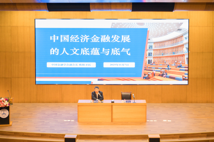 欧阳卫民结合自身多年在金融领域丰富的管理和研究经验,旁征博引,深入浅出,娓娓道来,运用丰富的实际案例和古今中外的经典引述,深入剖析了当前中国经济发展的韧性与潜力,强调人文精神在金融活动中的深层价值。他指出,面对复杂多变的外部环境,唯有坚定信心、秉持长期主义,方能穿越周期、行稳致远。创新驱动的本质在于人的创造力,教育的根本任务正是培养具有家国情怀和全球视野的高素质人才。他强调,金融不仅是数字与资本的流动,更是文化与信任的传递。以华为、比亚迪等企业为例,他深刻阐明产品背后体现的是人的品格与企业的价值观,唯有坚守诚信、追求卓越,方能赢得全球尊重。欧阳卫民博士勉励青年学子,在全球化竞争日益激烈的当下,商科人才不仅要具备扎实的专业知识,更需拥有深厚的人文素养,这样才能更好地适应社会发展的需求,为社会和国家创造更大的价值。