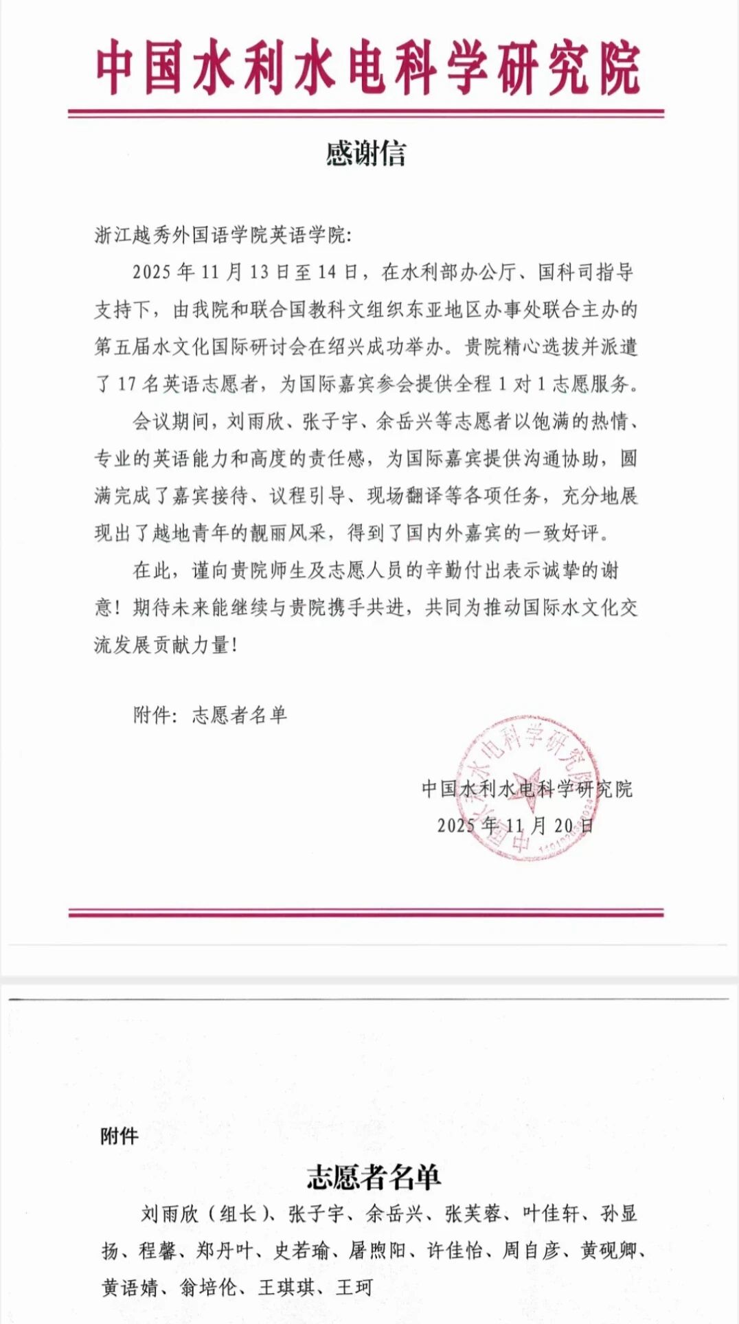 近日,一封来自中国水利水电科学研究院的感谢信送达我院,字里行间满是对英语学院蒲公“英”志愿者在第五届水文化国际研讨会上全情投入与细致服务的高度赞誉。这抹志愿亮色并非孤例,整个十一月,蒲公“英”志愿服务的种子乘风漫撒,在校园与城市的肌理中次第绽放,绘就了一幅满含热忱与担当的青春画卷。