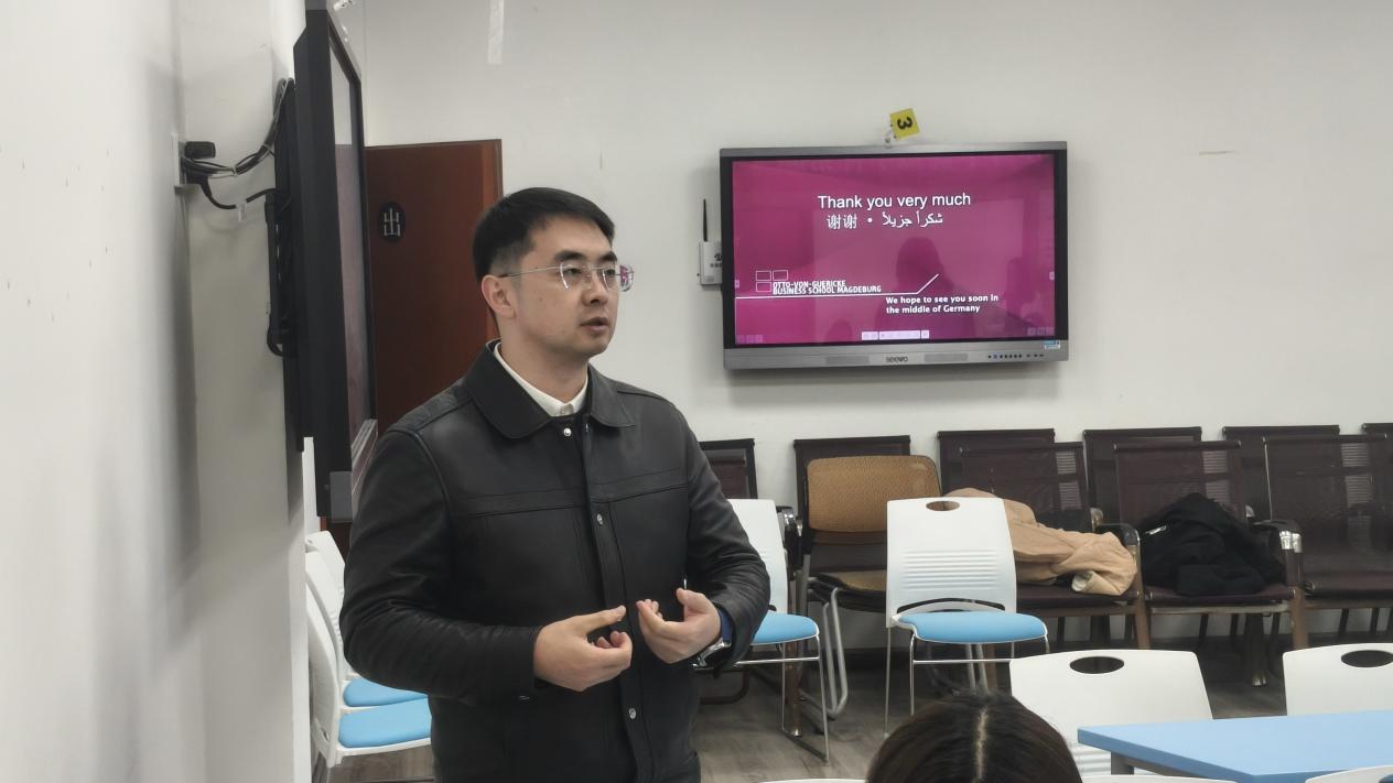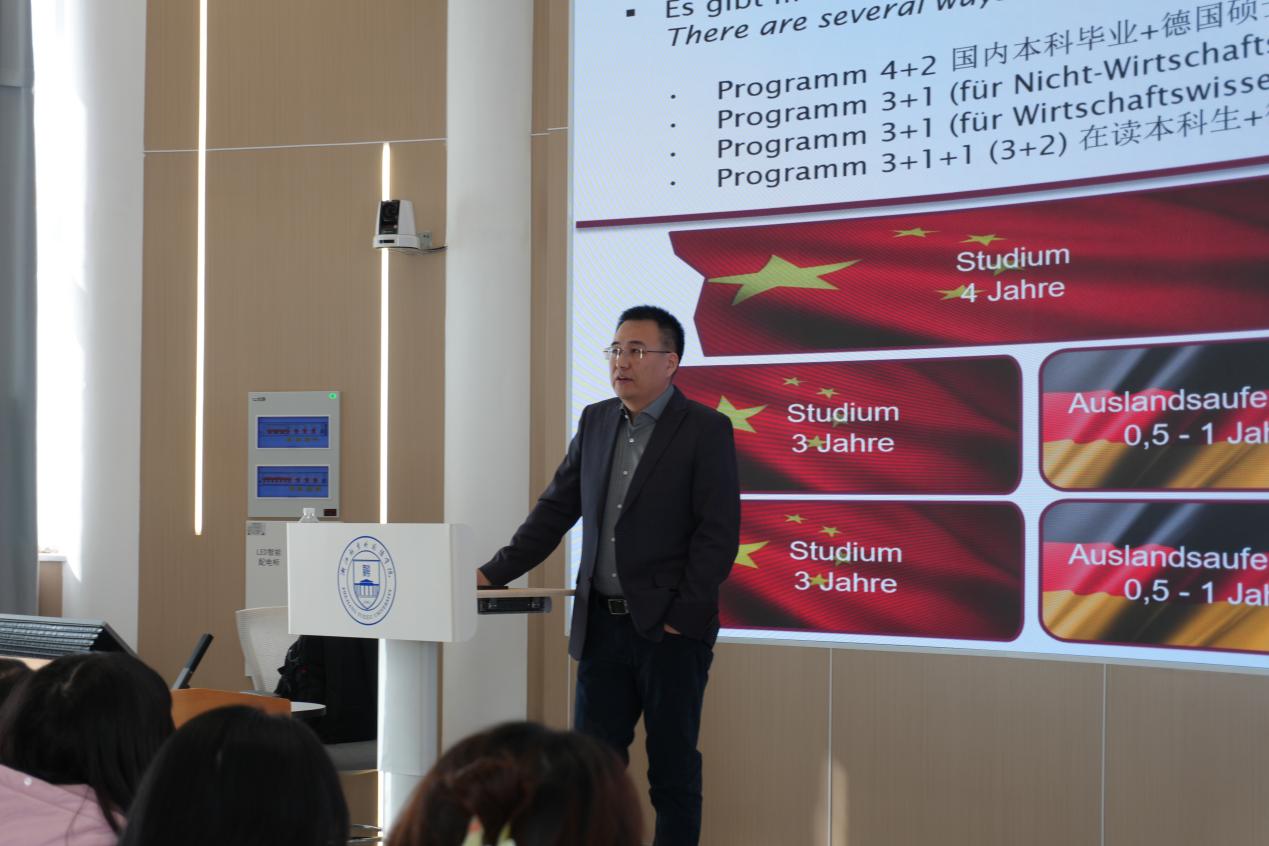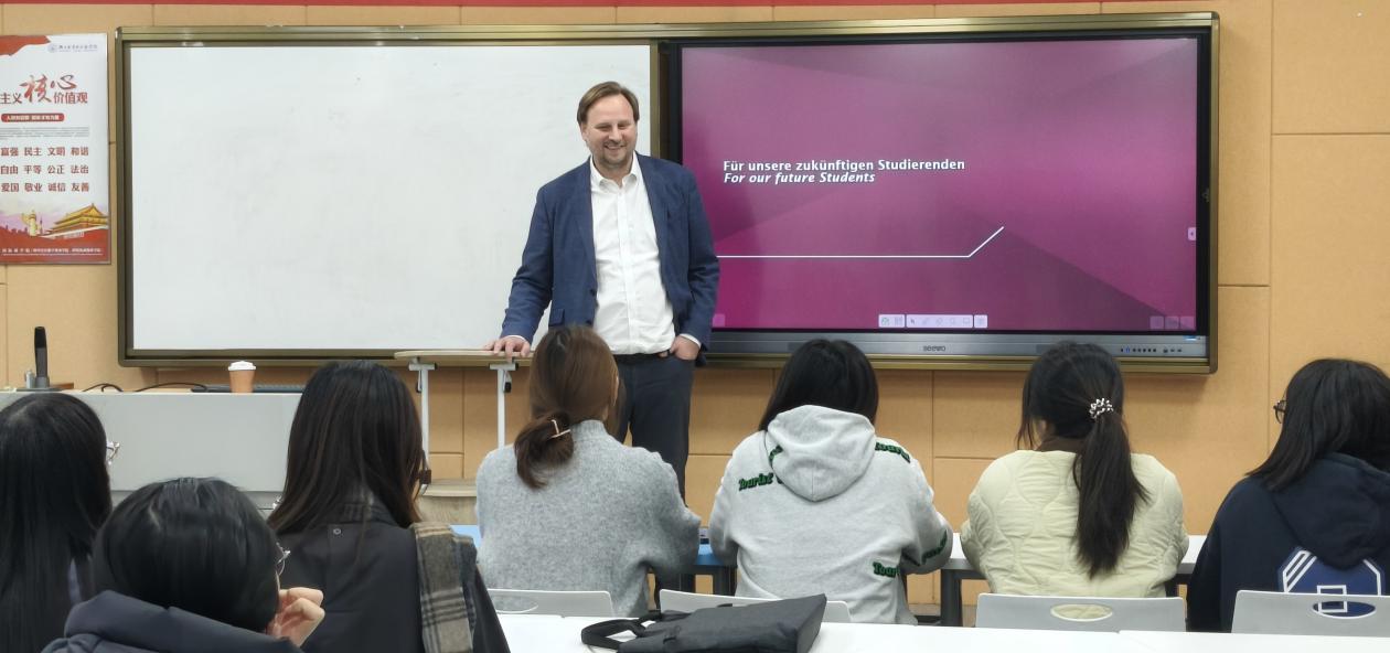 执行院长Christian Stahr在镜湖与稽山两校区发表宣讲,系统介绍学院的办学理念与教育特色,并重点解析多项多元化升学路径。ChristianStahr指出,该项目具备专业背景包容性强、无需工作经验、入学机制灵活等优势,为学生赴德深造提供了清晰指引。中国办事处负责人贺林夫随后就语言要求、申请流程、在德学习生活及就业前景等学生关切问题作出细致解答。商学院教师梁春兰亦作为德国马格德堡大学校友,结合自身留学经历,分享跨文化学习中的成长与收获,鼓励学生拓展国际视野。