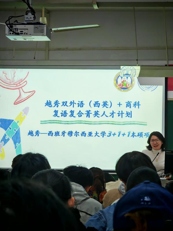 西方语言学院西班牙语系副系主任彭璐娇全面解读穆尔西亚大学ENAE商学院本硕留学项目,系统梳理从申请到毕业的整体流程,并深入剖析课程架构与专业方向。她强调,该项目作为“越秀国际复语复合菁英人才计划”的重要组成部分,通过“双外语+商科”的复语复合课程体系,实施“桥梁式”培养,旨在打破学科壁垒,塑造具备双语能力与前沿商科知识的国际菁英。