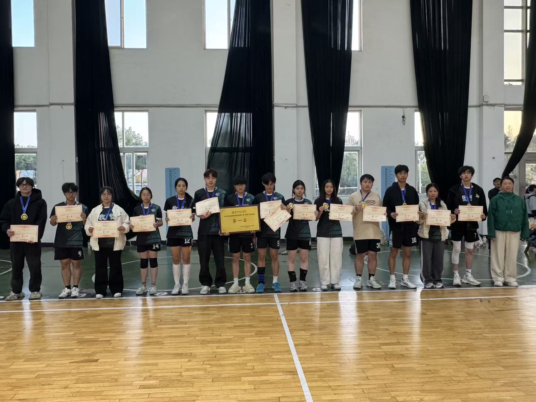 闭幕式上,体育部主任张岚教授、副主任李德奇副教授分别给获得前六名次及体育道德风尚奖学院颁发奖牌,优秀运动员、裁判员颁发奖励证书。校女排主教练裁判员何迎花副教授宣布了各奖项获得名单。
