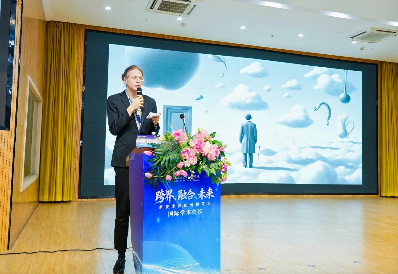 来自海外的专家同样带来了精彩的发言。来自澳大利亚的Max Schleser教授在题为《The Future is Now》(未来就在眼前)的演讲中以移动叙述的视角,展望了未来视觉传播的发展。同时,分享了自己对新技术发展潜力等方面的直观感受。来自新西兰的Dafydd Sills-jones教授,在题为《The Impact of New Technologies on Communication》(新兴技术对传播领域的影响)的演讲中从国际传播的宏观视角,剖析了新兴技术带来的深远影响,提供了宝贵的国际经验。来自法国的Gaby David教授,在题为《Questioning the Digital Ecosystem》(对于数字⽣态系统的思考)的演讲中聚焦媒介传播的变革,结合国际案例进行分析,观点新颖、内容详实。最后,来自德国的Christoph Stahl教授在题为《Future technology and the end of visual communication as we knowit》(未来技术与视觉传播范式的终结)的演讲中对未来技术与视觉传播范式的变革进行了大胆预判,引发大家对传播形态未来发展的深入思考。