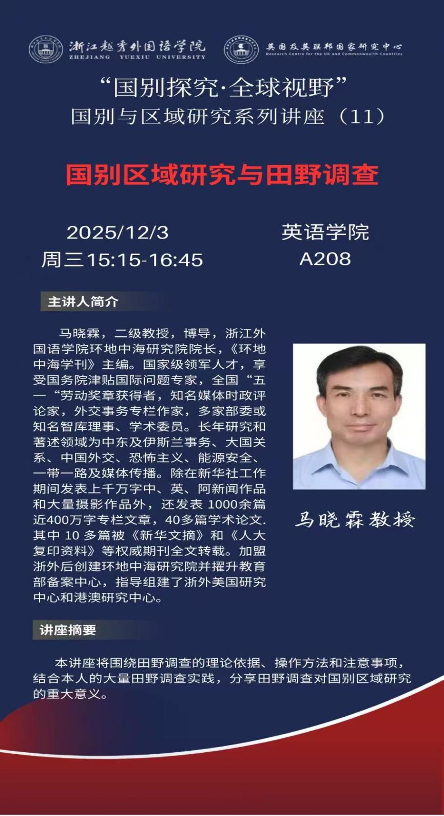 2025年12月3日,英语学院邀请国际问题专家,浙江外国语学院环地中海研究院院长、《环地中海学刊》主编马晓霖教授在A208做题为“区域国别研究与田野调查”的专题讲座。本次讲座为英国及英联邦国家研究中心“国别探究·全球视野”系列讲座第十一讲,由英语学院副院长徐英教授主持,吸引了英语学院及其他院系的三十多位师生参与。