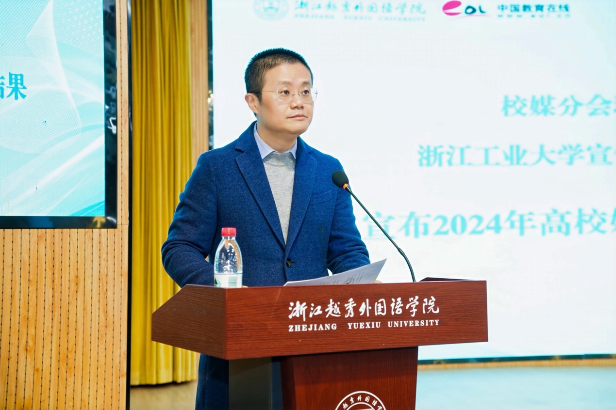 校媒分会副理事长单位、浙江工业大学宣传部副部长黄均辉宣布2024年高校好新闻作品获奖结果,中教智网副总经理杨鹏贤为获奖高校代表颁奖。