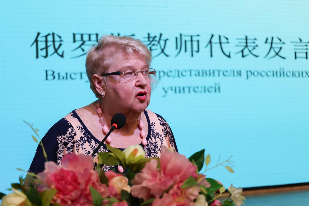 俄罗斯教师代表欧丽佳回顾了两校合作交流历程。她高度认可融入中国传统文化的研学项目。她还介绍了首次交流随行的三名俄罗斯学生已从浙江越秀外国语学院毕业,目前正从事国际贸易工作。